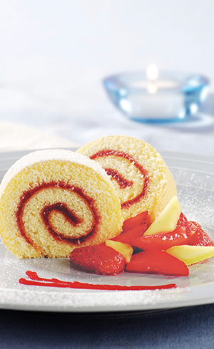 - Je déroule le biscuit et j’étale la confiture sur toute sa surface. Je le roule à nouveau et je le pose dans un plat. Je saupoudre de sucre glace et je décore à ma convenance.